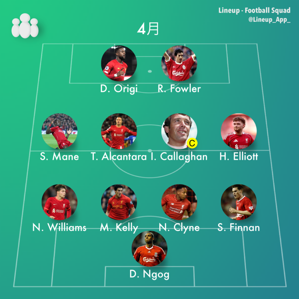 中盤は、クラブの歴代最多出場記録保持者であるイアン・キャラハン(4月10日)は流石に入れた方が良さそうなので、チアゴ・アルカンタラ(4月11日)と組ませることにします。右サイドにはハーヴェイ・エリオット(4月4日)を置き、左サイドにはサディオ・マネ(4月10日)を文句なしで採用。2トップは“ゴッド”の愛称でファンから親しまれたロビー・ファウラー(4月9日)と、彼とはまた別な意味でカルト的な人気を誇ったディッヴォク・オリギ(4月18日)の2人に任せることとします。
