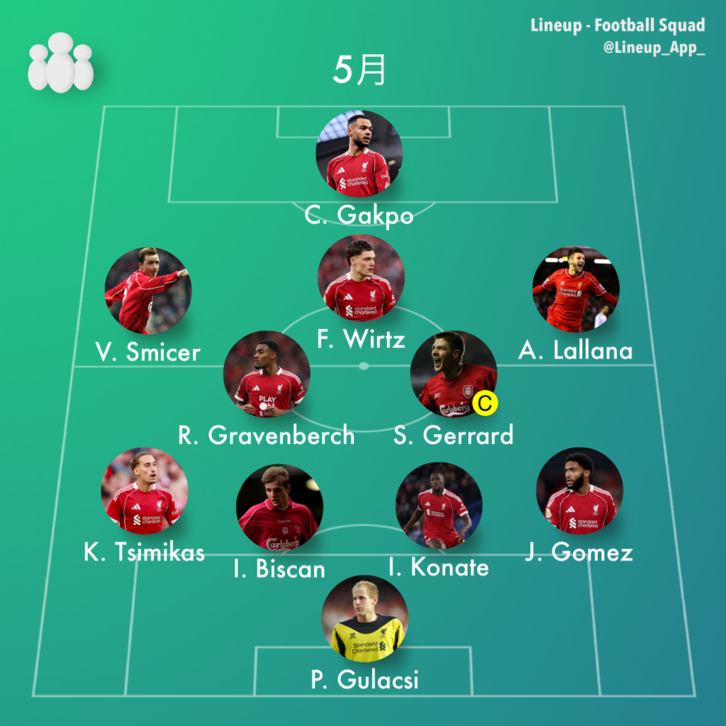 中盤は、クラブ史上最高のレジェンドの1人で“人類のキャプテン”ことスティーブン・ジェラード(5月30日)と、ライアン・フラーフェンベルフ(5月16日)の2人を組ませます。右サイドにはアダム・ララーナ(5月10日)、左サイドにはヴラディーミル・スミチェル(5月24日)をそれぞれ配置し、トップ下には新時代のリバプールの象徴となるであろうフロリアン・ヴィルツ(5月3日)。CFには目ぼしいストライカーがいなかったので、コーディ・ガクポ(5月7日)に任せることにしました。