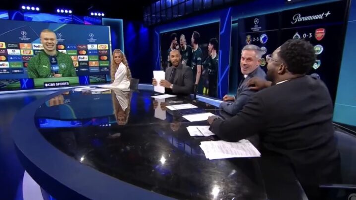 番組では、まずはレギュラーアナリストのマイカ・リチャーズ(元マンチェスターシティ)が開始のあいさつを一言、言いました。するとハーランドがすかさずジョークでキャラ苛めを飛ばしたのです。